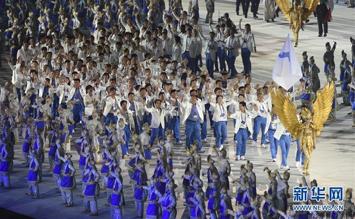 新華社雅加達8月18日電(記者 陸睿)第18屆亞運會當?shù)貢r間18日晚7時在雅加達朋加諾體育場揭開帷幕。繼今年2月韓國平昌冬奧會開幕式之后,朝鮮和韓國體育代表團再次攜手在國際體育盛會共同入場,引發(fā)現(xiàn)場觀眾歡呼。
