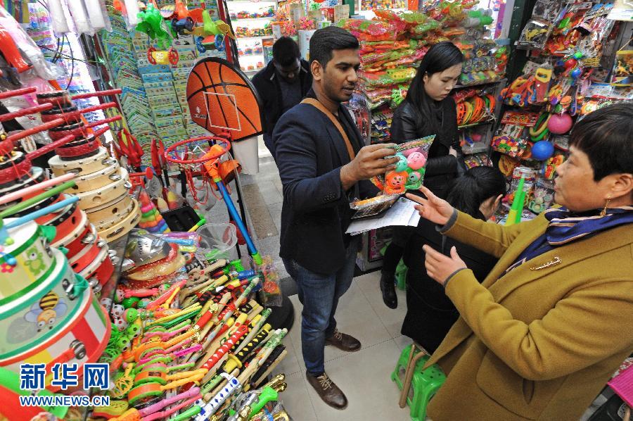 浙江義烏國(guó)際商貿(mào)城小商品經(jīng)營(yíng)戶(右一)和一名非洲客商談生意(2017年1月5日攝)。 新華社記者 譚進(jìn) 攝
