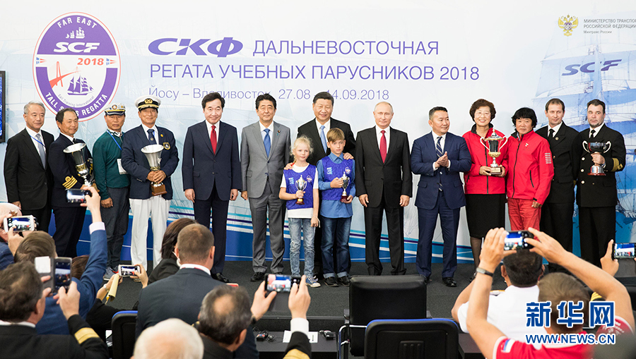 9月12日,第四屆東方經(jīng)濟(jì)論壇全會在符拉迪沃斯托克舉行。中國國家主席習(xí)近平、俄羅斯總統(tǒng)普京、蒙古國總統(tǒng)巴特圖勒嘎、日本首相安倍晉三、韓國總理李洛淵等出席。這是全會后,與會各國領(lǐng)導(dǎo)人共同出席第三屆“遠(yuǎn)東杯”國際帆船拉力賽第一賽段頒獎儀式。 新華社記者黃敬文攝
