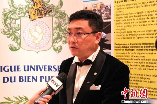9月21日晚,中國工筆畫家崔景哲在巴黎榮獲全球公益聯(lián)盟文學(xué)(藝術(shù))金質(zhì)勛章,也是此次頒獎典禮所有獲獎?wù)咧形ㄒ灰晃恢袊?。圖為崔景哲接受媒體采訪。李洋 攝