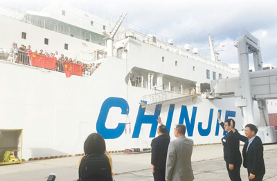 9月10日,中國駐大阪總領(lǐng)館工作人員把因臺風(fēng)滯留日本關(guān)西國際機場的部分中國旅客送上助其返鄉(xiāng)的“新鑒真”號。資料圖片