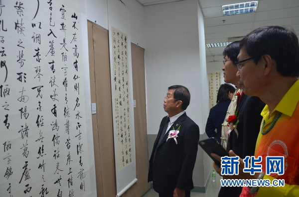 嘉賓欣賞參展書(shū)法作品。新華網(wǎng)發(fā)(王大瑋攝)
