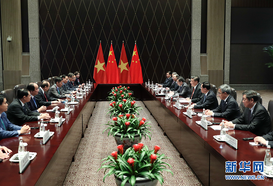 11月4日,國家主席習近平在上海會見越南總理阮春福。 新華社記者 丁海濤 攝