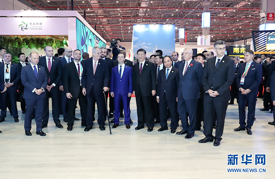 中午,習(xí)近平同外國領(lǐng)導(dǎo)人一同步入國家貿(mào)易投資綜合展展廳。他們邊走邊看,邊看邊談,先后參觀了匈牙利、埃及、英國、捷克、肯尼亞、薩爾瓦多、多米尼加、老撾、格魯吉亞、越南、巴基斯坦、俄羅斯等國展區(qū),了解各國經(jīng)貿(mào)發(fā)展成就和特色優(yōu)勢產(chǎn)品。習(xí)近平和各國領(lǐng)導(dǎo)人通過視頻欣賞了匈牙利的美麗風(fēng)光、領(lǐng)略了埃及的悠久文明和現(xiàn)代發(fā)展規(guī)劃,共同體驗(yàn)了英國館炫酷時(shí)尚的裸眼3D視頻。在捷克館,澤曼總統(tǒng)用捷克產(chǎn)鋼琴即興演奏一曲,并邀請習(xí)近平品嘗捷克啤酒。肯尼亞的鮮花、薩爾瓦多的咖啡、多米尼加的水果,琳瑯滿目的各國特色產(chǎn)品吸引中外領(lǐng)導(dǎo)人頻頻駐足。格魯吉亞總理和越南總理親自向習(xí)近平推介本國農(nóng)產(chǎn)品和旅游項(xiàng)目。老撾館的中老鐵路項(xiàng)目沙盤和巴基斯坦館的中巴經(jīng)濟(jì)走廊展板分別展現(xiàn)了中老、中巴共建“一帶一路”、實(shí)現(xiàn)共同發(fā)展的美好愿景。在俄羅斯館,習(xí)近平在梅德韋杰夫總理陪同下聽取中俄在核電、天然氣、飛機(jī)制造、地方交往等領(lǐng)域合作成就介紹,共同展望中俄合作的廣闊前景。