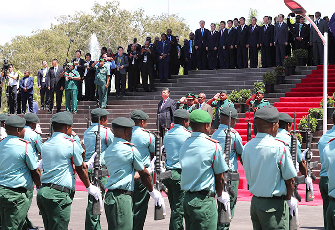 11月16日,國(guó)家主席習(xí)近平在莫爾茲比港會(huì)見(jiàn)巴布亞新幾內(nèi)亞總督達(dá)達(dá)埃。會(huì)見(jiàn)開(kāi)始前,達(dá)達(dá)埃在議會(huì)大廈前廣場(chǎng)為習(xí)近平舉行隆重歡迎儀式。新華社記者 丁林 攝