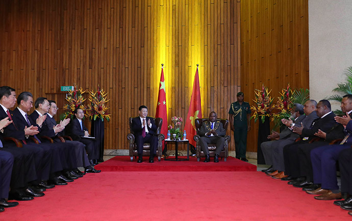 11月16日,國(guó)家主席習(xí)近平在莫爾茲比港分別會(huì)見(jiàn)建交太平洋島國(guó)領(lǐng)導(dǎo)人。這是習(xí)近平會(huì)見(jiàn)紐??偫硭?。新華社記者 丁林 攝