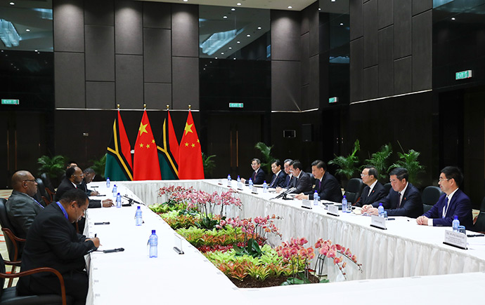 11月16日,國家主席習(xí)近平在莫爾茲比港分別會見建交太平洋島國領(lǐng)導(dǎo)人。這是習(xí)近平會見瓦努阿圖總理薩爾瓦伊。新華社記者 謝環(huán)馳 攝