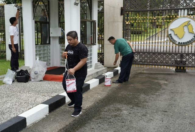 工人沙斯旺(中間)在努洛伊曼王宮大門(mén)外粉刷和清洗地面。新華社記者畢曉洋攝