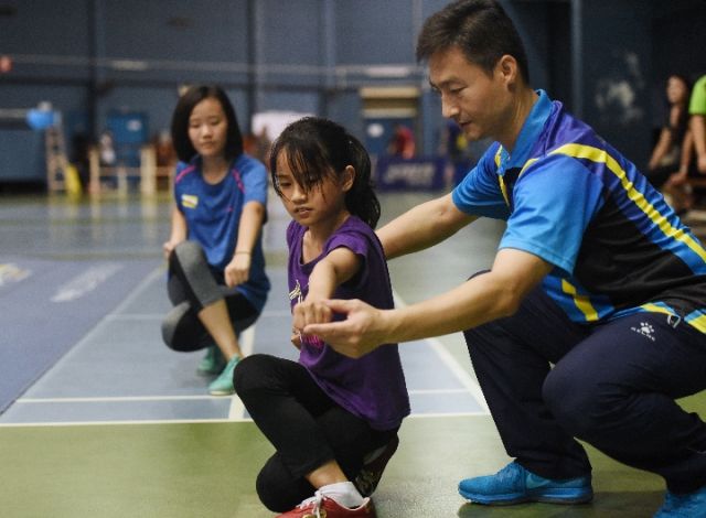 文萊國(guó)家武術(shù)隊(duì)教練李輝(右)在指導(dǎo)文萊學(xué)生武術(shù)動(dòng)作。新華社記者王申攝