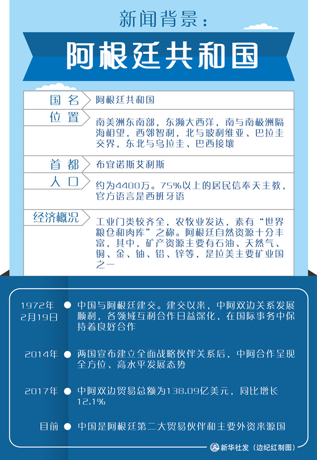 1972年2月19日,中國與阿根廷建交。建交以來,中阿雙邊關系發(fā)展順利,各領域互利合作日益深化,在國際事務中保持著良好合作。2014年兩國宣布建立全面戰(zhàn)略伙伴關系后,中阿合作呈現(xiàn)全方位、高水平發(fā)展態(tài)勢。目前,中國是阿根廷第二大貿(mào)易伙伴和主要外資來源國。2017年中阿雙邊貿(mào)易總額為138.09億美元,同比增長12.1%。