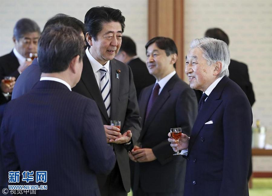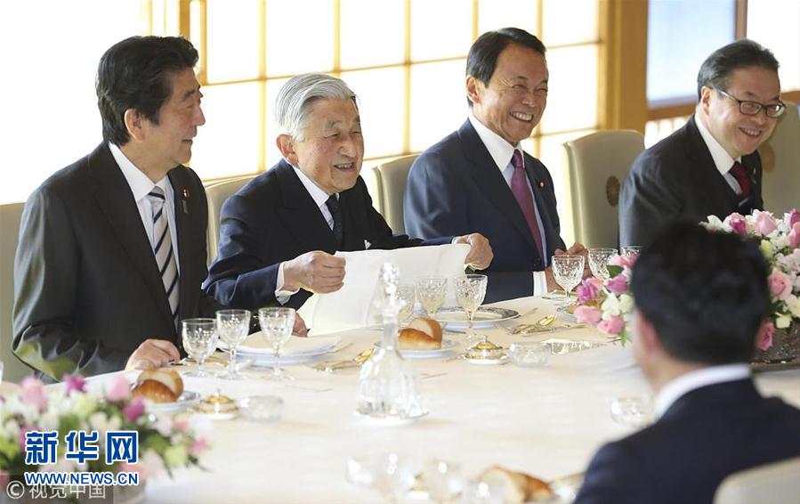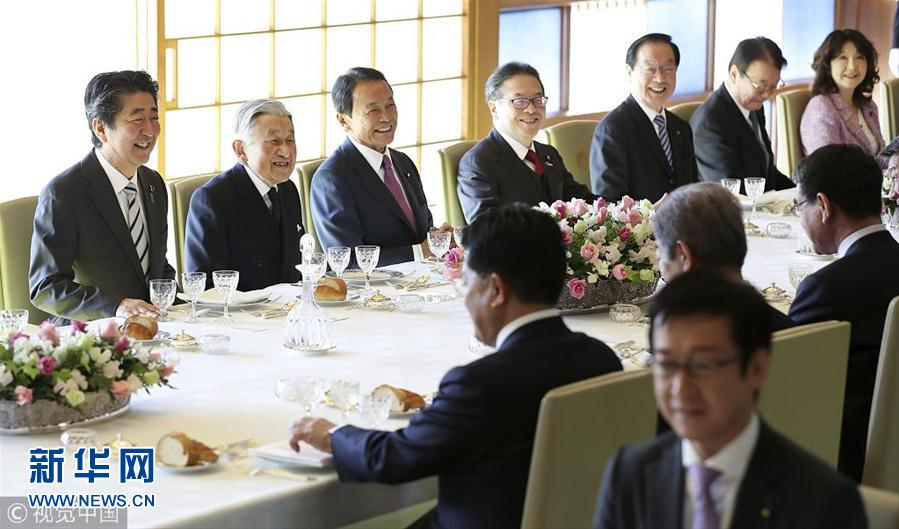 當?shù)貢r間2018年12月17日,日本東京,日本明仁天皇在皇宮與日本首相安倍晉三領導的政府高官共進年終午餐。(圖片來源:視覺中國)