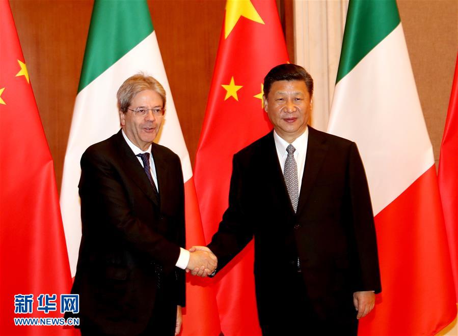 2017年5月16日,習(xí)近平在北京釣魚臺(tái)國(guó)賓館會(huì)見來(lái)華出席“一帶一路”國(guó)際合作高峰論壇的時(shí)任意大利總理真蒂洛尼。(新華社記者劉衛(wèi)兵攝)