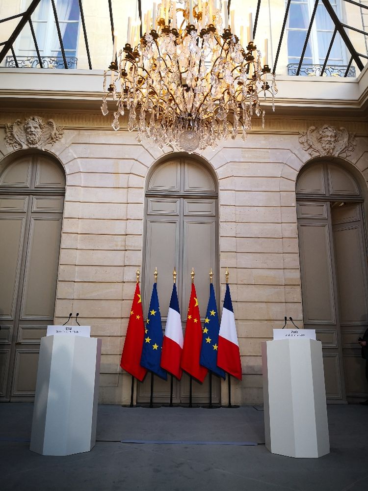 3月25日,這是兩國(guó)元首在愛(ài)麗舍宮共同會(huì)見(jiàn)記者前的場(chǎng)景。中國(guó)國(guó)旗、歐盟旗幟、法國(guó)國(guó)旗間隔排列。新華社記者 霍小光 攝