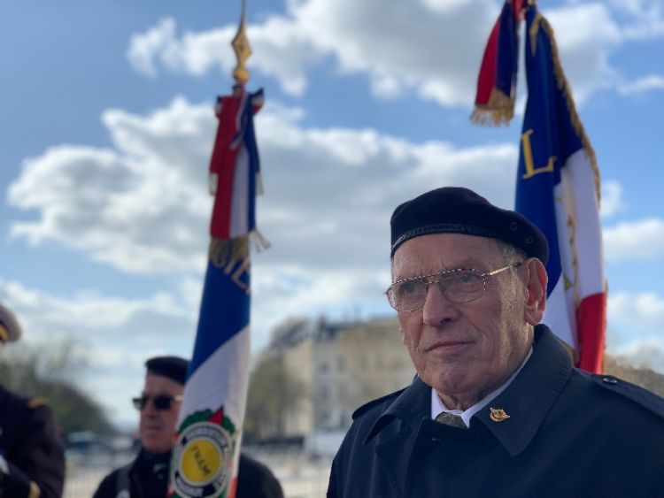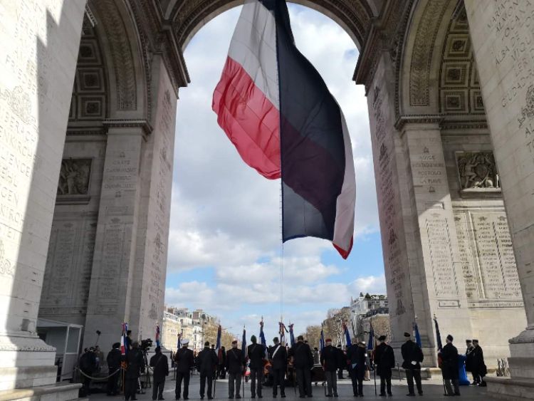 法國(guó)老戰(zhàn)士在凱旋門前。新華社記者 高潔 攝