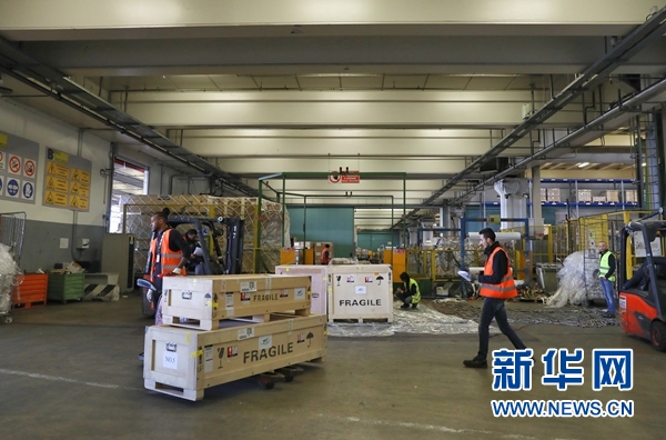 4月8日,在意大利米蘭馬爾彭薩機(jī)場(chǎng),工作人員準(zhǔn)備將打包好的中國(guó)流失文物藝術(shù)品按規(guī)格裝到集裝板上,為中國(guó)流失文物藝術(shù)品上機(jī)作準(zhǔn)備。? 新華社記者 程婷婷 攝