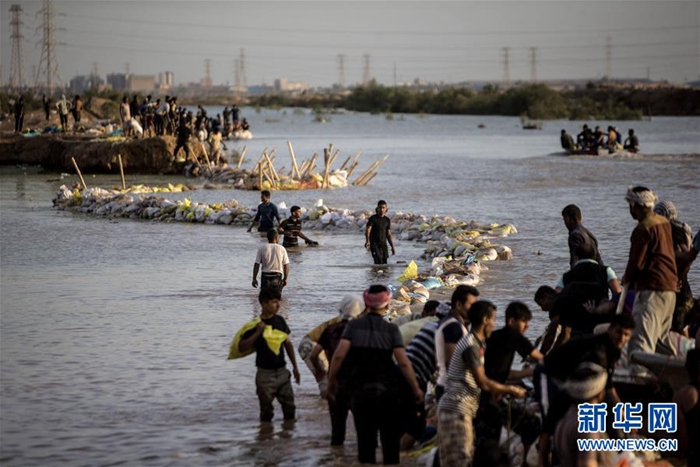 4月11日,在伊朗阿瓦士附近,人們在搭建防洪堤。近期,伊朗境內(nèi)持續(xù)洪澇災(zāi)害。新華社發(fā)(艾哈邁德·哈拉比薩斯 攝)