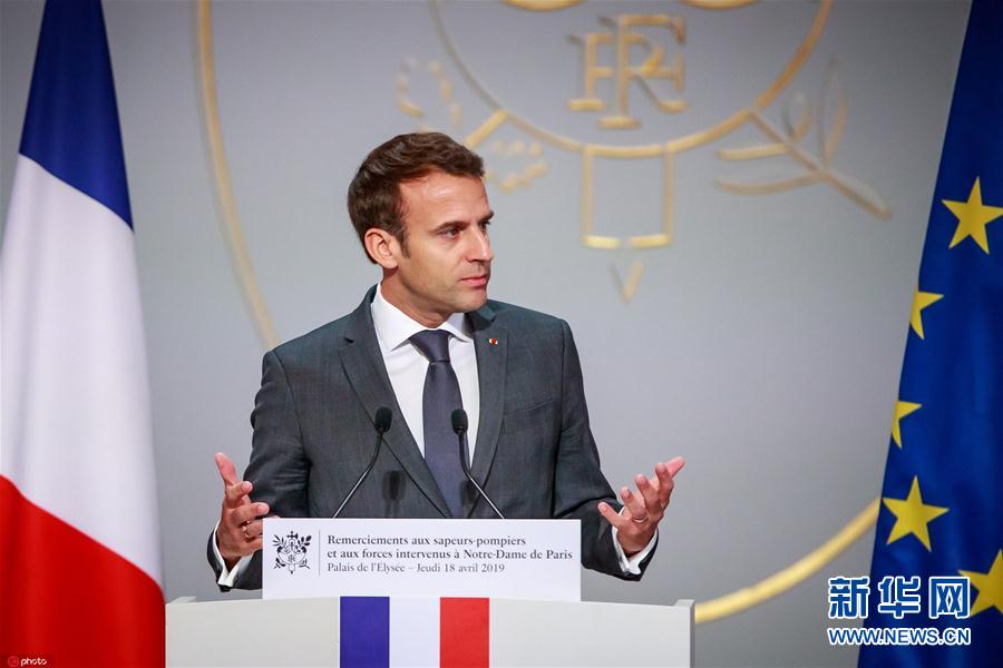 當地時間2019年4月18日,法國巴黎,法國總統(tǒng)馬克龍在愛麗舍宮接見參與巴黎圣母院火災救援任務的消防員。(圖片來源:東方IC)