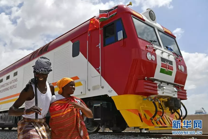 2017年1月11日,在肯尼亞蒙巴薩,當?shù)孛癖娫谥袊兄频拿蓛辱F路首批內燃機車旁載歌載舞。新華社記者孫瑞博攝