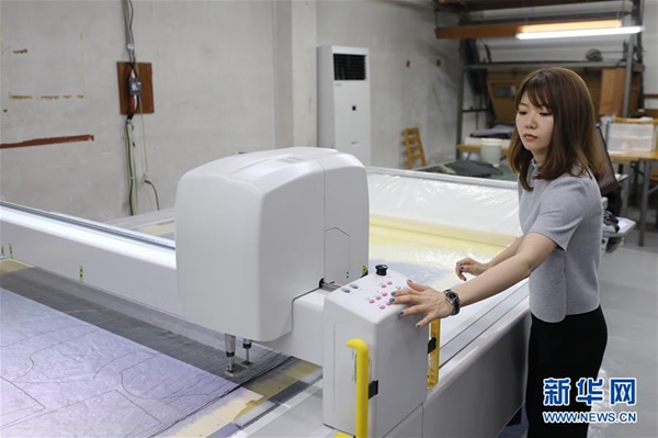 這是5月17日在日本和歌山縣,岡田織物公司的工作人員使用合作研發(fā)的專用機器剪裁人造毛皮。新華社記者 杜瀟逸 攝
