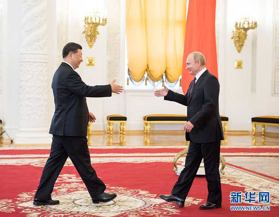 6月5日,國家主席習(xí)近平在莫斯科克里姆林宮同俄羅斯總統(tǒng)普京會(huì)談。這是會(huì)談前,兩國元首緊緊握手,合影留念。 新華社記者 丁海濤 攝