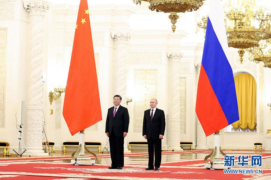 會(huì)談前,普京總統(tǒng)在克里姆林宮喬治大廳為習(xí)近平舉行隆重歡迎儀式。