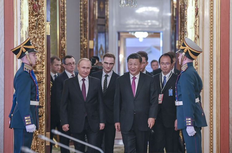 6月5日,國家主席習(xí)近平在莫斯科克里姆林宮同俄羅斯總統(tǒng)普京會談。這是兩國元首步入會場。新華社記者謝環(huán)馳攝