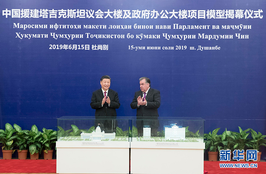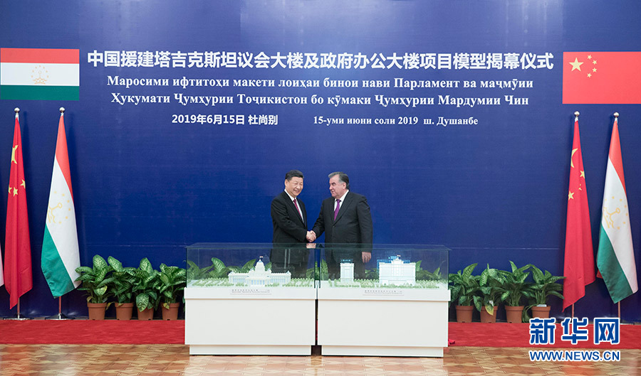 6月15日,國家主席習(xí)近平在杜尚別同塔吉克斯坦總統(tǒng)拉赫蒙會談。會談后,兩國元首共同出席中方援塔議會大樓、政府辦公大樓項目模型揭幕儀式。 新華社記者 王曄 攝