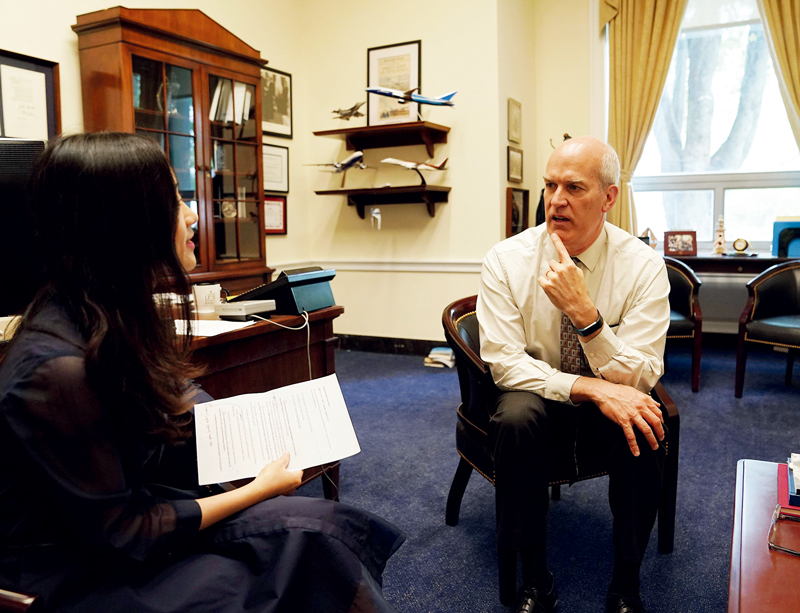 越來越多美國有識之士認識到,美國政府加征關(guān)稅會損害美國民眾利益。圖為2019年5月9日,美國國會眾議院美中工作小組共同主席、華盛頓州民主黨聯(lián)邦眾議員里克·拉森(右)在華盛頓接受采訪時表示,美國政府對華產(chǎn)品加征關(guān)稅的做法損害美國工人與消費者利益,不利于美國經(jīng)濟,也無助于解決兩國經(jīng)貿(mào)問題。 新華社記者 劉杰/攝