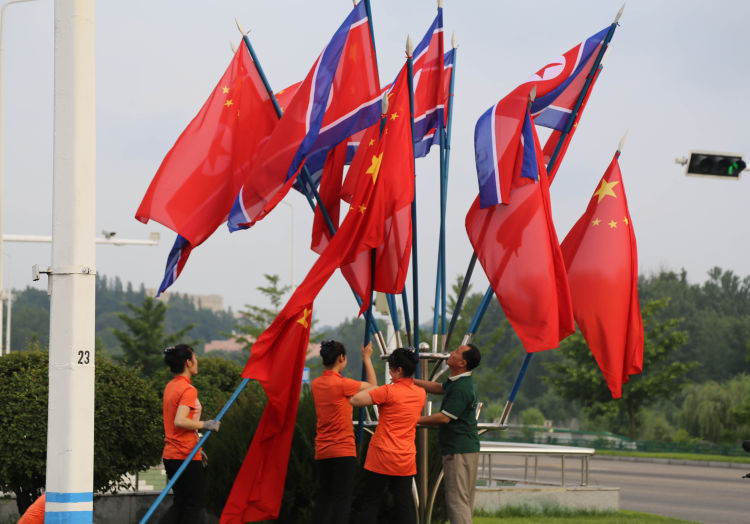 6月19日,當(dāng)?shù)毓ぷ魅藛T在平壤市區(qū)街邊安裝朝中兩國(guó)國(guó)旗。新華社記者江亞平攝