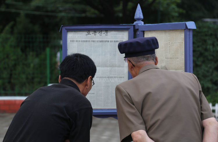 6月19日,在平壤凱旋門附近的一處報(bào)紙櫥窗前,市民閱讀習(xí)近平總書記在朝鮮主流媒體《勞動(dòng)新聞》發(fā)表的署名文章。新華社記者江亞平攝