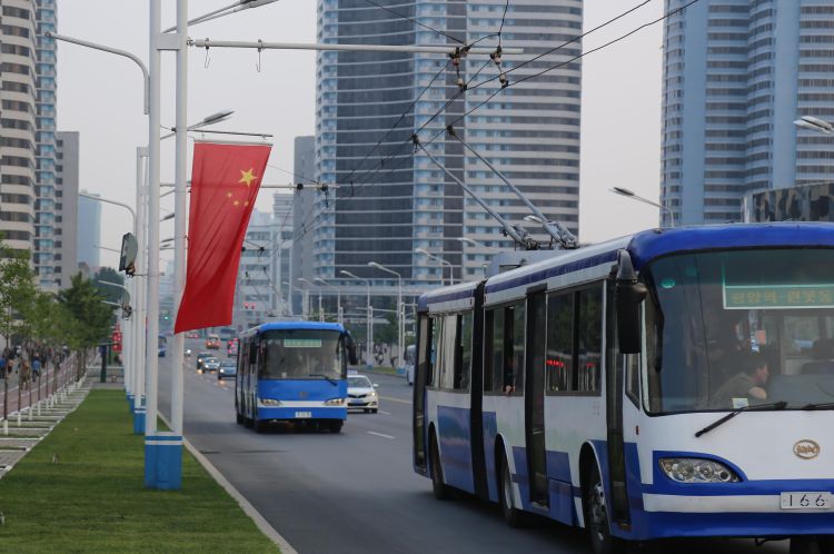 6月19日,平壤市區(qū)主要大街倉田大街兩旁已經(jīng)懸掛著朝中兩國(guó)國(guó)旗。新華社記者江亞平攝