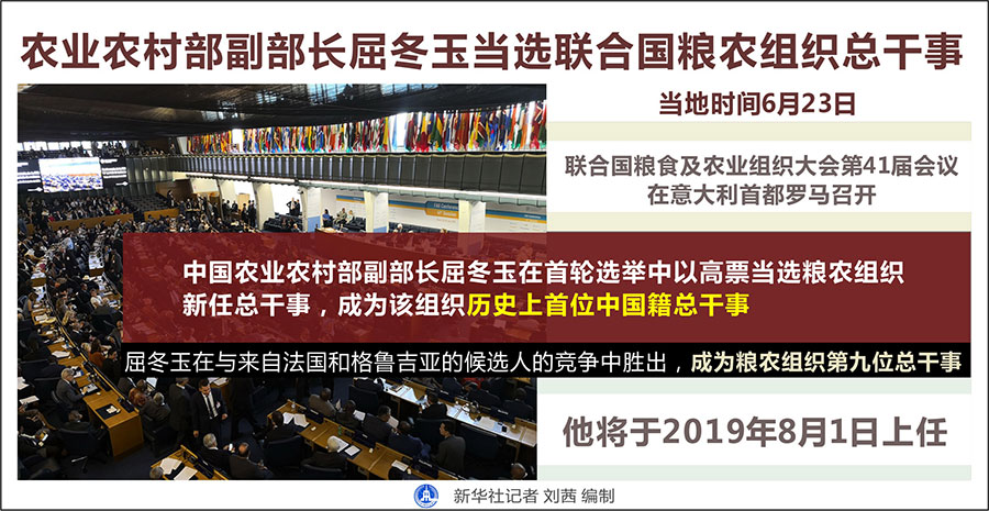當(dāng)日,屈冬玉在與來(lái)自法國(guó)和格魯吉亞的候選人的競(jìng)爭(zhēng)中勝出,成為糧農(nóng)組織第九位總干事。他將于今年8月1日上任。