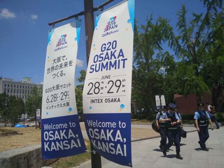 入夏的大阪,驕陽燦爛,綠意蔥蘢,海風輕拂路人。隨著峰會臨近,在大阪主要景區(qū)、酒店、商廈及干道,均可以看到帶有二十國集團領(lǐng)導人大阪峰會元素的標牌、海報和條幅。