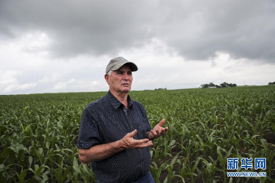 6月18日,在美國艾奧瓦州大西洋鎮(zhèn),農(nóng)場(chǎng)主比爾·佩雷特在自家的玉米地里接受采訪。?新華社記者 王迎 攝