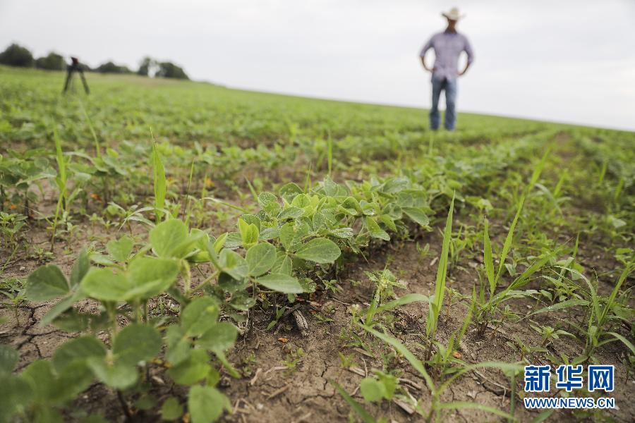 6月18日,在美國艾奧瓦州大西洋鎮(zhèn),農(nóng)場(chǎng)主比爾·佩雷特的兒子杰伊·佩雷特在自家田地里查看大豆的生長(zhǎng)情況。 新華社記者 王迎 攝