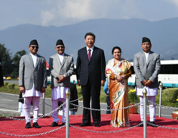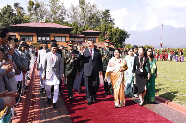 10月12日,國(guó)家主席習(xí)近平乘專(zhuān)機(jī)抵達(dá)加德滿都,開(kāi)始對(duì)尼泊爾進(jìn)行國(guó)事訪問(wèn)。尼泊爾總統(tǒng)班達(dá)里在機(jī)場(chǎng)為習(xí)近平舉行具有濃郁尼泊爾民族特色的歡迎儀式。新華社記者高潔攝