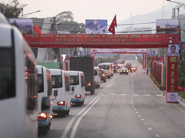 10月12日,尼泊爾首都加德滿都,車(chē)隊(duì)經(jīng)過(guò)一道道迎賓拱門(mén)。新華社記者丁林?jǐn)z
