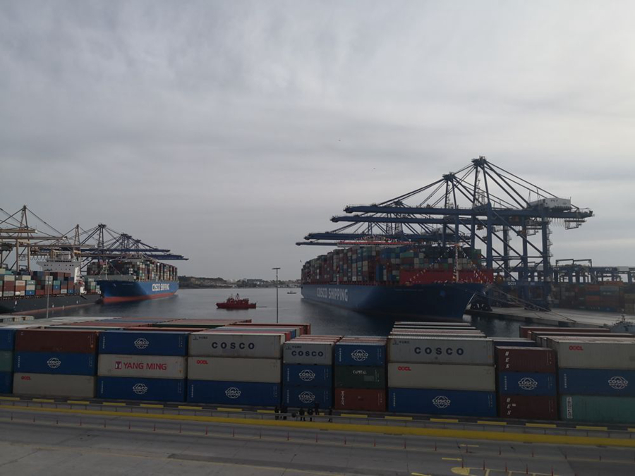 兩艘巨輪,一艘是2萬標(biāo)準(zhǔn)箱級(jí)集裝箱船“中遠(yuǎn)海運(yùn)獅子座”,一艘是1.4萬標(biāo)準(zhǔn)箱級(jí)集裝箱船“中遠(yuǎn)海運(yùn)比利時(shí)”,它們滿載著來自中國、新加坡、越南、馬來西亞的貨物,從太平洋經(jīng)由蘇伊士運(yùn)河駛?cè)氲刂泻?,將由比港駛往荷蘭鹿特丹和德國漢堡。