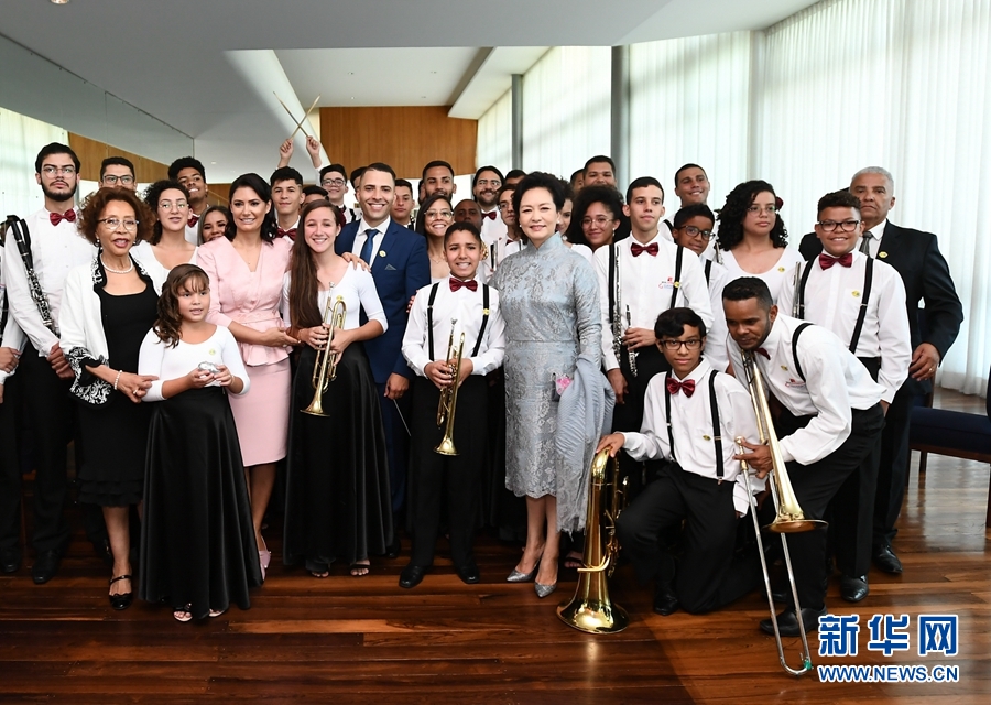 當(dāng)?shù)貢r(shí)間11月13日中午,應(yīng)巴西總統(tǒng)夫人米歇爾邀請,國家主席習(xí)近平夫人彭麗媛出席金磚國家領(lǐng)導(dǎo)人配偶活動。這是彭麗媛同巴西青少年管樂團(tuán)演員們親切交流。 新華社記者 謝環(huán)馳 攝