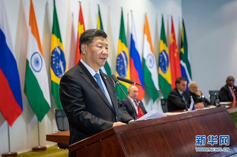 當?shù)貢r間11月14日,金磚國家領(lǐng)導(dǎo)人同金磚國家工商理事會和新開發(fā)銀行對話會在巴西利亞舉行。中國國家主席習(xí)近平、巴西總統(tǒng)博索納羅、俄羅斯總統(tǒng)普京、印度總理莫迪、南非總統(tǒng)拉馬福薩共同出席。這是習(xí)近平發(fā)表講話。 新華社記者 李學(xué)仁 攝