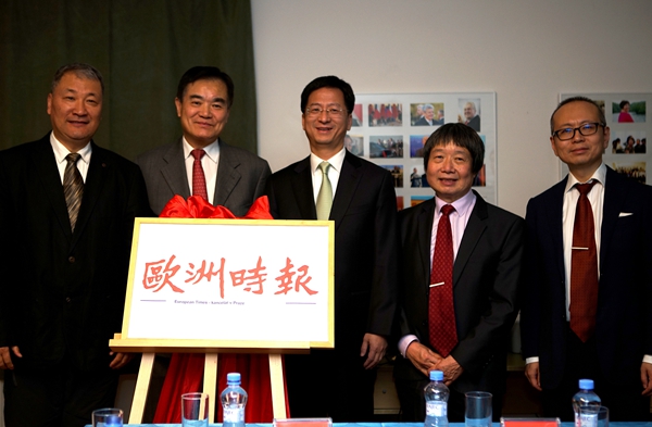 張曉貝(左二)張建敏(左三)共同為歐洲時(shí)報(bào)社捷克辦事處揭牌。達(dá)娜·科什奈洛娃 攝