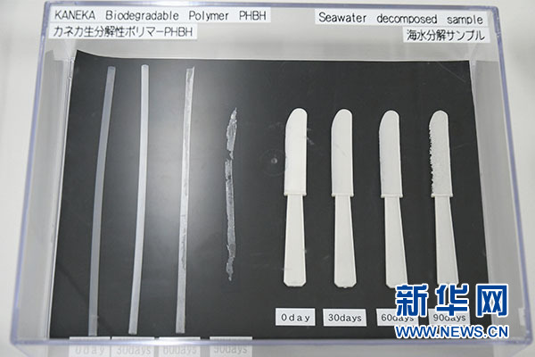 鐘化公司是日本一家知名化學品公司,記者日前前往鐘化公司的大阪總部,參觀了該公司研發(fā)的可降解聚合物“PHBH”。據(jù)介紹,這種可自然降解聚合物“PHBH”百分之百來源于植物,通過培養(yǎng)攝取植物油的微生物進行生產(chǎn)提取,可用于制造各種塑料制品,“PHBH”在自然界中可被多種微生物分解。鐘化公司還實物展示了“PHBH”塑料制品在海水中自然降解的不同階段,例如一根吸管在海水中90天幾乎可被自然降解殆盡。