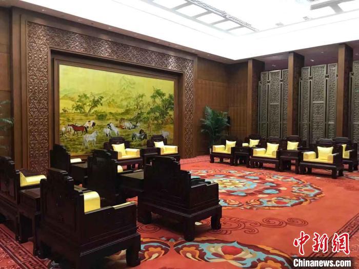 陳玉樹介紹,《松風》的創(chuàng)作靈感源自宮廷舊藏——乾隆時期紫檀嵌玉寶座。作品采用世界名貴木材和純手工雕刻工藝,其椅面寬大,直靠背,搭腦后延似卷書狀,上雕蝙蝠銅錢周邊輔以拐子龍圖樣,寓意“福壽雙全”。扶手兩側均刻以松枝寓長青不老、堅韌忠貞之意??勘嘲逡愿叱摹敖z翎檀雕”工藝雕以“松鶴延年圖”。后背板更雕以“五福捧壽”圖樣,前后呼應,福壽雙至。座面下打洼束腰,拐子紋飾直牙條,方腿直下,半部略呈鼓腿后順沿而下外翻祥云紋馬蹄足。整套造型體量寬大,紋飾繁復,具有典型的清式家具特色。