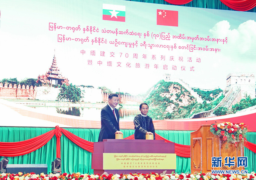 當(dāng)?shù)貢r(shí)間1月17日晚,國家主席習(xí)近平在內(nèi)比都第二國際會議中心出席中緬建交70周年慶?;顒?dòng)暨中緬文化旅游年啟動(dòng)儀式。這是習(xí)近平和緬甸總統(tǒng)溫敏共同按下按鈕,正式啟動(dòng)中緬文化旅游年。 新華社記者 黃敬文 攝