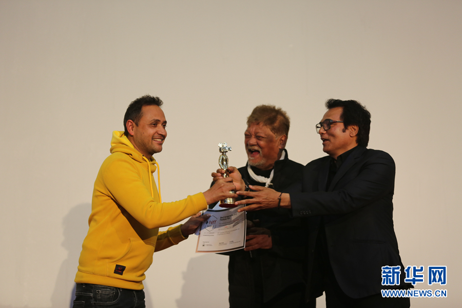 2月17日,第三屆尼泊爾國際電影節(jié)的閉幕儀式在加德滿都市政大廳內(nèi)舉行,資深電影人士正在給獲獎者(左)頒獎。本屆電影節(jié)2月13日開始,一共有來自40個國家和地區(qū)的80部影片入選,其中中國和哈薩克斯坦聯(lián)合拍攝的《音樂家》作為開幕電影,備受關注。記者 唐薇 攝?
