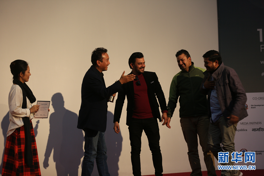 2月17日,尼泊爾加德滿都市政大廳,在第三屆尼泊爾國際電影節(jié)的閉幕儀式上,頒獎嘉賓祝賀獲獎的電影制作團隊。本屆電影節(jié)2月13日開始,一共有來自40個國家和地區(qū)的80部影片入選,其中包括中國和哈薩克斯坦聯(lián)合拍攝的《音樂家》。記者 唐薇 攝
