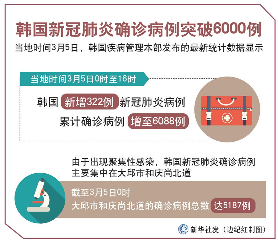 新華社首爾3月5日電(記者陸睿 耿學(xué)鵬)韓國疾病管理本部5日發(fā)布的最新統(tǒng)計數(shù)據(jù)顯示,當(dāng)?shù)貢r間5日0時至16時,韓國新增322例新冠肺炎病例,累計確診病例增至6088例。