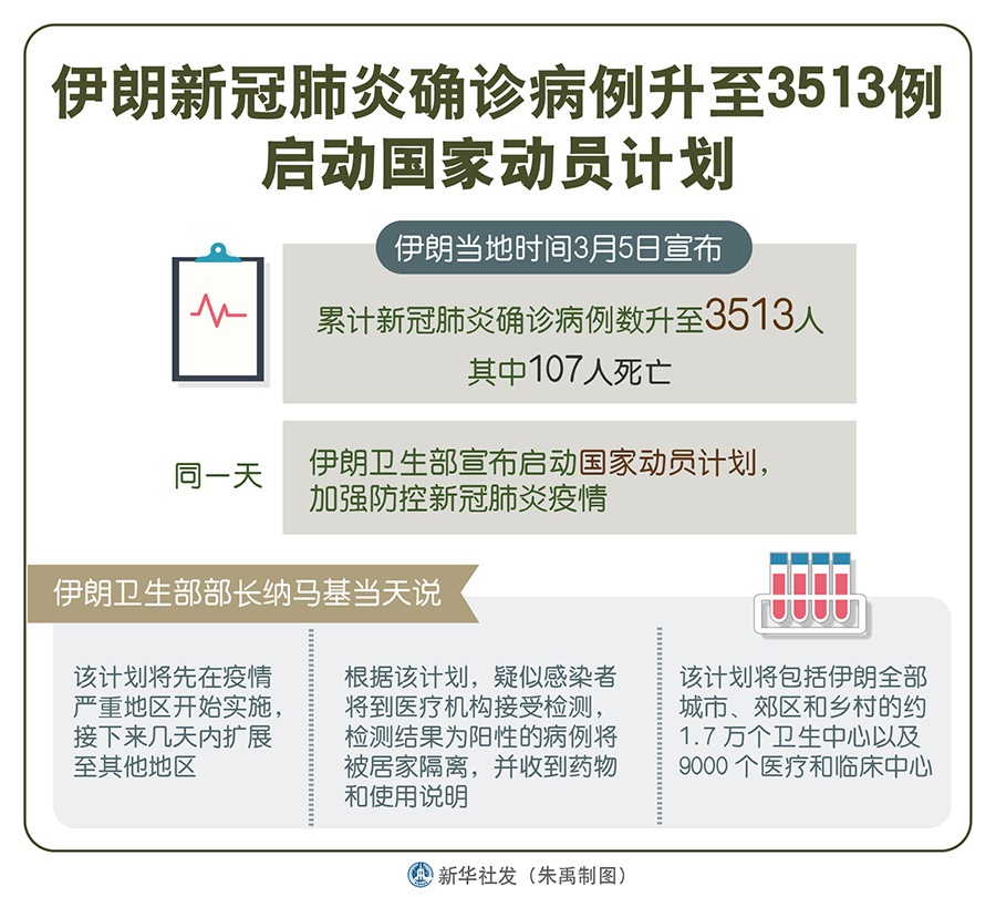 新華社德黑蘭3月5日電(記者陳霖)伊朗5日宣布累計新冠肺炎確診病例數升至3513人。同一天,伊朗衛(wèi)生部宣布啟動國家動員計劃,加強防控新冠肺炎疫情。