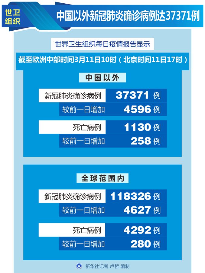 世衛(wèi)組織每日疫情報(bào)告顯示,截至歐洲中部時(shí)間11日10時(shí)(北京時(shí)間11日17時(shí)),中國(guó)以外新冠肺炎確診病例較前一日增加4596例,達(dá)到37371例;中國(guó)以外死亡病例較前一日增加258例,達(dá)到1130例。