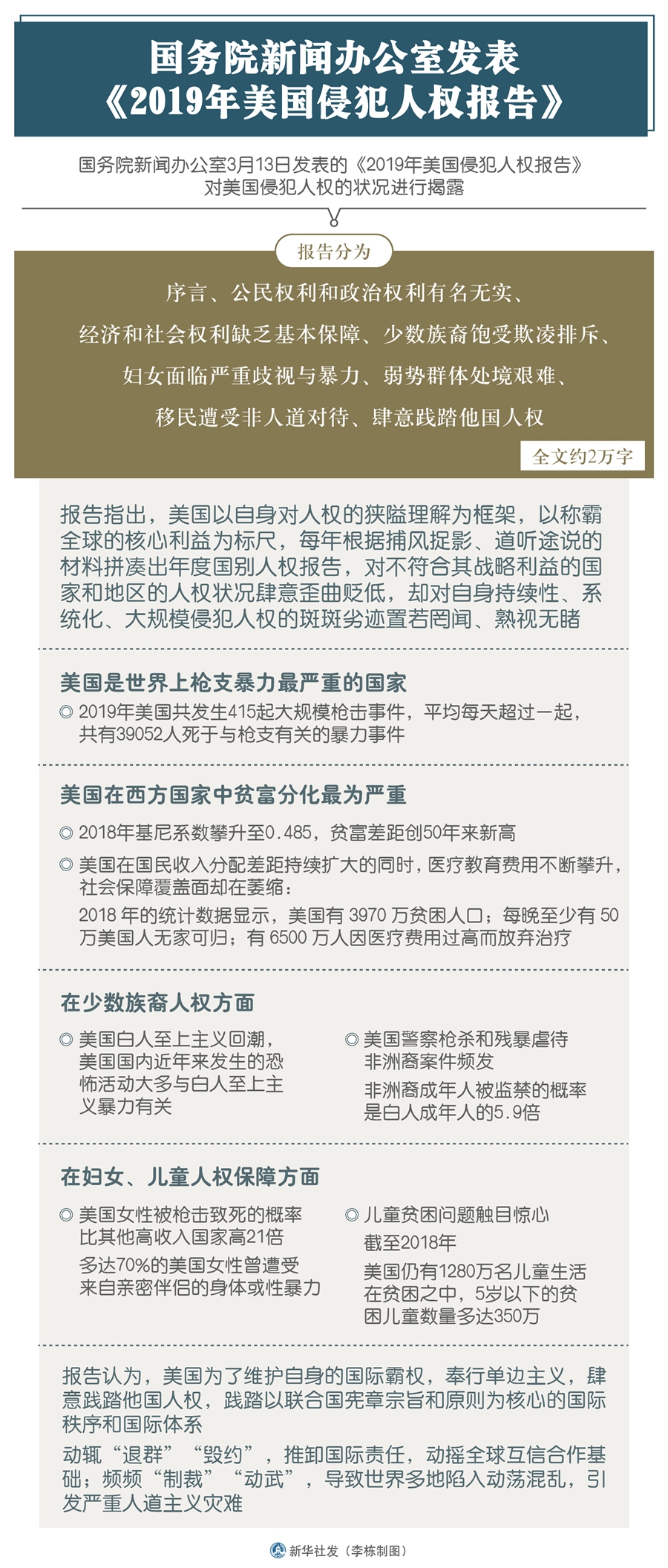 新華社北京3月13日電(記者王子銘、張云龍)國務(wù)院新聞辦公室13日發(fā)表《2019年美國侵犯人權(quán)報告》,對美國侵犯人權(quán)的狀況進(jìn)行揭露。
